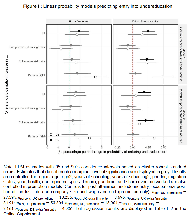 A significant share of employees in Europe has less formal training than is required by their job; they are undereducated. We use harmonized panel data from the United Kingdom and Germany to investigate the skills and resources allowing the undereducated to develop careers in occupations supposedly beyond their reach. Our theoretical approach complements individual-centered labor market theory with an intergenerational mobility perspective which regards undereducation as a form of family status maintenance. Our empirical results show that persons whose (non-)cognitive skills exceed their formal education are more likely to be undereducated in the cross-section, and to enter undereducated employment or be promoted into it throughout the life course. Yet beyond individual merit, parental socio-economic status is a similarly-important predictor of these outcomes; our analyses even trace a significant share of the importance of (non-)cognitive skills to it. To complete our intergenerational argument, we finally demonstrate that undereducation acts as a pathway to the intergenerational reproduction of earnings inequality – more so, in fact, than the avoidance of overeducation. These results are remarkably similar across the UK and Germany, although some country differences suggest higher skill-induced career mobility in Britain and stronger origin effects in Germany. We discuss promising avenues for further comparative research in the conclusion.